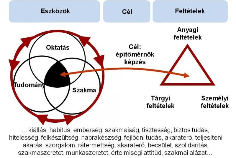 Az egymáshoz szorosan kapcsolódó és igen nehezen elválasztható eszköz, feltétel és célrendszer elemeit az Építőmérnöki Tanszék az alábbiakban képzeli el
