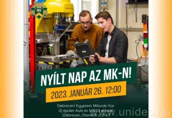 A képzésekről, a laborokról és az elhelyezkedési esélyekről is tájékozódhatnak a középiskolások a Debreceni Egyetem Műszaki Karán január 26-án, csütörtökön. Az Ótemető utcai épületben délben kezdődő és 18 óráig tartó rendezvényen a kar valamennyi tanszéke képviselteti magát, valamint a debreceni BMW gyár szereléstervezési vezetője is előadást tart.