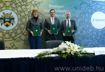 Oktatási és szakmai együttműködési megállapodást kötött kedden a Debreceni Egyetem Műszaki Kara és a Krones Hungary Kft., amely a jövőben Géptervezői Kihelyezett Tanszékként segíti a leendő mérnökök gyakorlati képzését.